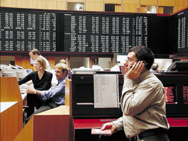 AGAINST THE BACKDROP of the Deutscher Aktienindex (DAX) big board companies, traders at the Frankfurt Stock Exchange prepare for the euro.